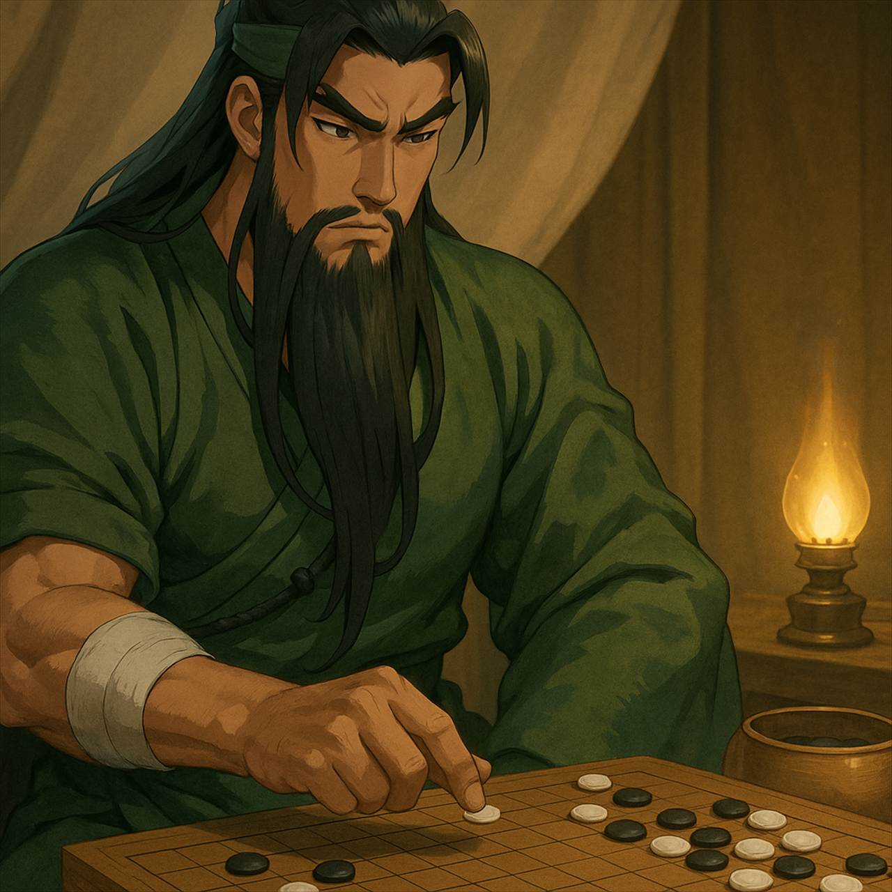 関羽は全く動じず、むしろ囲碁の勝負に熱中しているふうだった。しかし、よく見るとその額には微かに汗が浮かび、碁石を持つ左手はわずかに震えていた。それでも顔色一つ変えず、平静を保ち続ける。